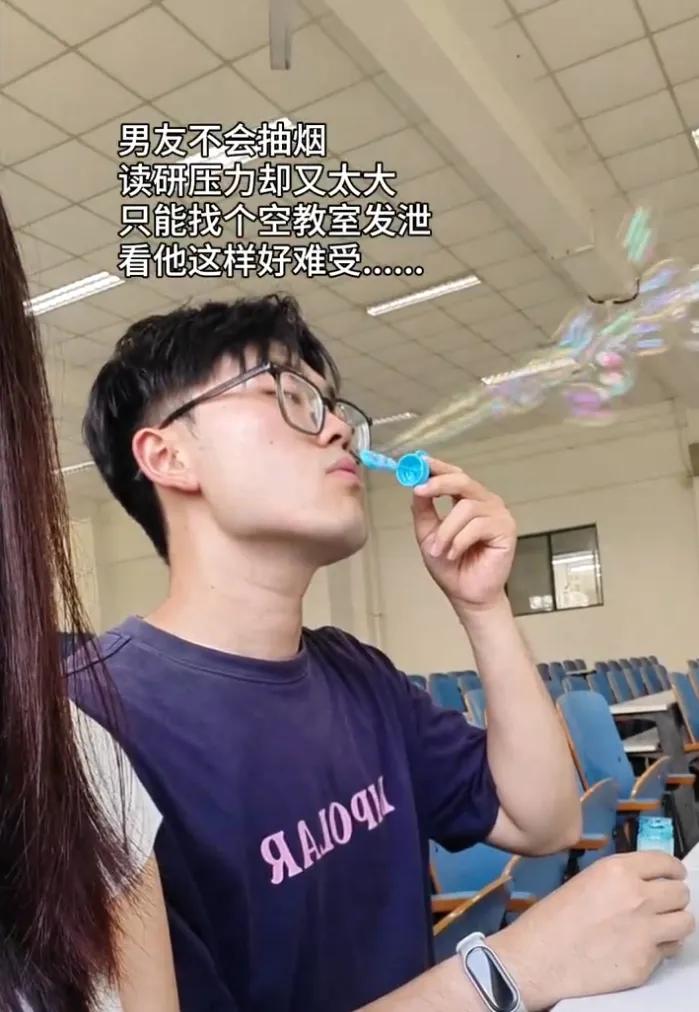 叼奶嘴之外,近期“吹泡泡”也成了互联网解压热门内容,在这些一脸愁容的吹泡泡视频当中,除了各有各的焦虑缘由,几乎所有人都把“不会抽烟,只能吹泡泡”的文案放在了上面。