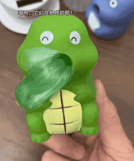 流沙质感的胶黏解压玩具常有,但能“交叉互食”的玩具可不常见,既能自己吸进去吐出来,还能让两个容器玩偶之间互喂互食,焦虑得以清除,吃的午饭也吐出去了。