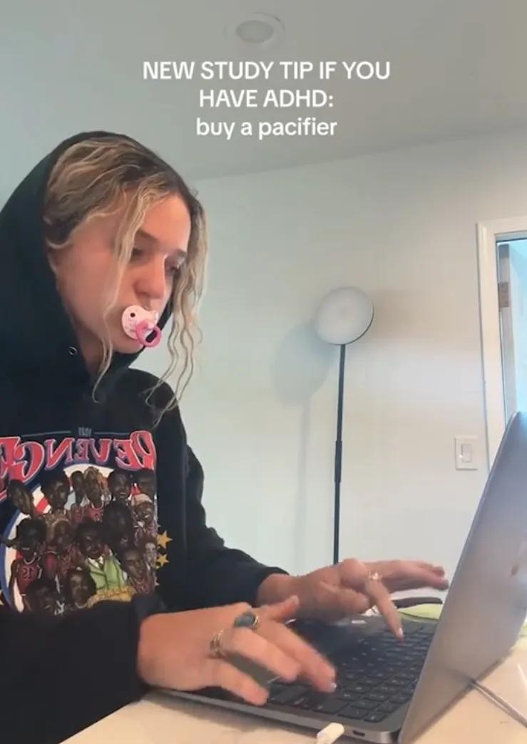 睡前玩手机含着、看书写作业含着、上班焦虑了偷偷跑角落里含着、还有主播边跳舞边含着,前有“赛博奶头乐”硬控精神领域,后有“现实大奶嘴”唑上了瘾,齐活儿了。